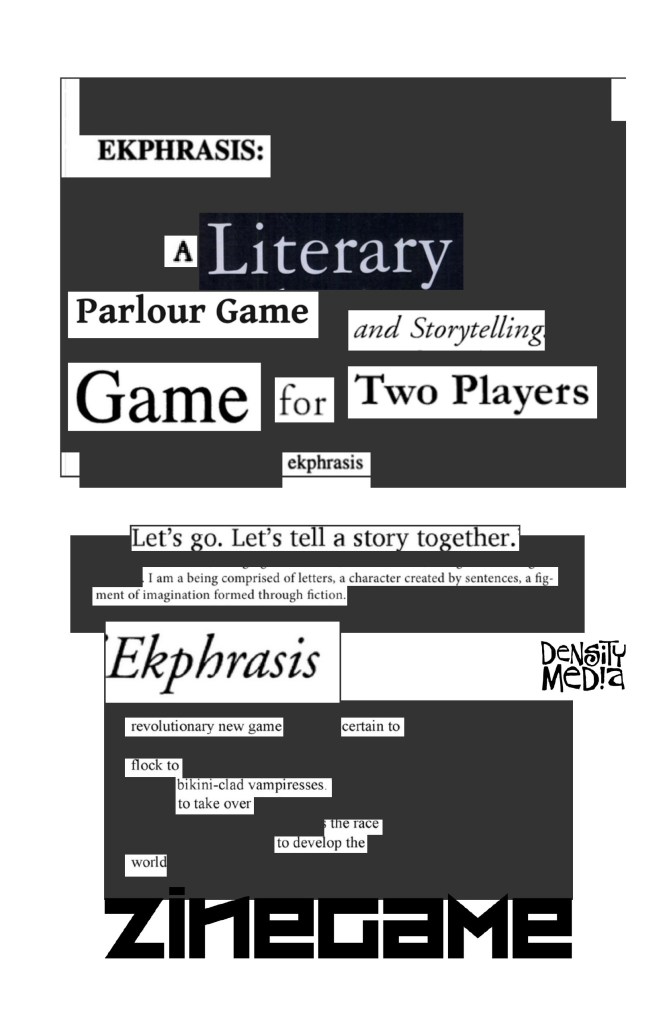 Description: Ekphrasis is a literary storytelling game. A game of stealing words from one story and making them your own. A game of surreal narratives. A two-player game of making art, physical and performance, interactive and permanent. Players sit down together, for about an hour, and repurpose words and texts, making them into something new. No matter the building blocks, likely, neither player has any idea where the story will go.